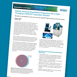 | 高通量微升流速技术、SWATH 采集技术和用于快速处理大数据的基于SCIEX云计算的 OneOMICS™ 软件。专为生物标记物的发现与研究提供的全流程解决方案。 | 基于微升流速色谱技术和可变窗口的SWATH®采集技术平台,可以每天快速定量分析超过几百个样品。 | SWATH®采集技术,可以用于大型组织生物样本库的大规模数字化。 |